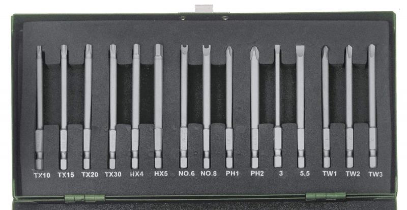 With 1/4" special bits (6.3mm) in standard length (25mm) and extra long for tapped blind holes (80mm). Including screwdriver with positive spring-sleeve holder for bits. Magnetic holder for work with electric screwdriver or drill. Adapter with male square and male hex drive and matching attachment with female square and female hex drive. Special attachment for centrically clamping screw hooks and similar parts. All in sturdy steel box with powder coated finish. All parts are clearly marked.