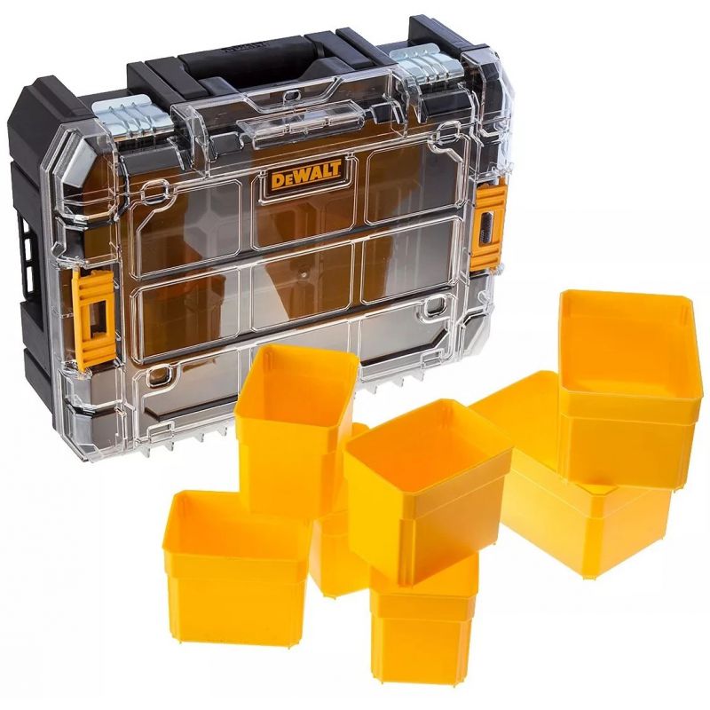 The DeWalt TSTAK V Organiser has 2 large and 5 small removable storage cups for storing small parts and accessories. Its unique heavy-duty lid design locks all compartments in place for secure storage. A built-in wide handle allows easy and stable portability, whilst the clear and impact resistant lid allows full visibility for quick access.