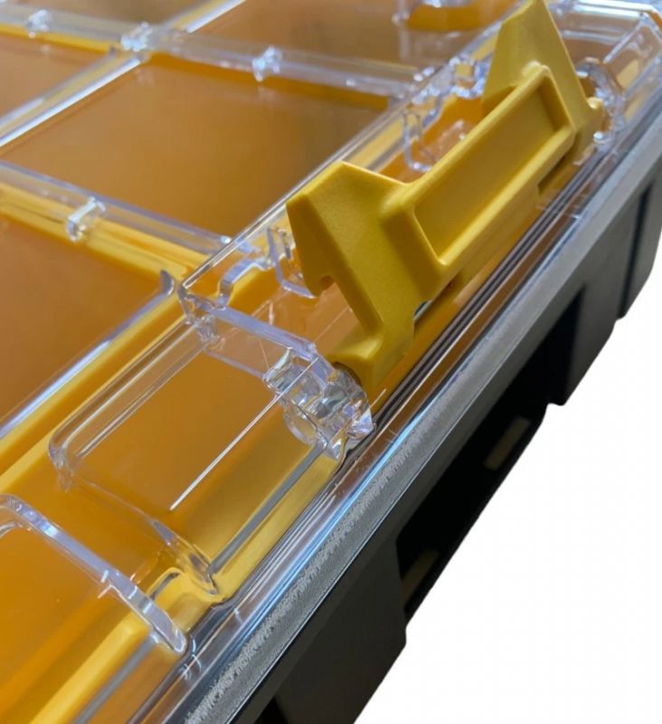 The organiser has strong, tough metal latches and metal hinges for heavy-duty use. Side latches allow it to be connected to other TSTAK organisers/boxes for easy carrying and safe stacking.