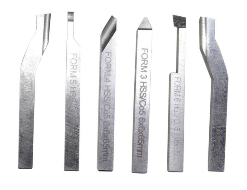 The set includes six cutters: one each for roughing, boring, parting, finishing, left, and right. They are made of high-strength, cobalt-enriched HSS steel. Each cutter measures 6x6 mm and is 60 mm long. They are used for turning metal surfaces, including steel blanks, as well as plastics.