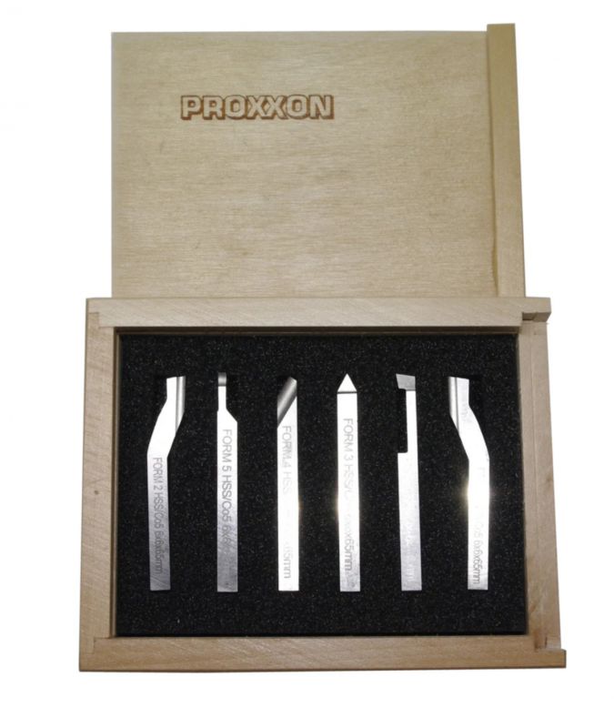 The 6x6x60 mm cutter set for the Proxxon FD 150/E is designed exclusively for use on the Proxxon FD150/E mini-lathe. They are easily secured with tool holders specifically designed for this lathe, which are made from solid chromium-plated steel, reducing vibration and significantly increasing the cutter life.