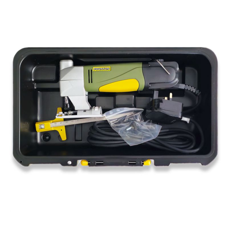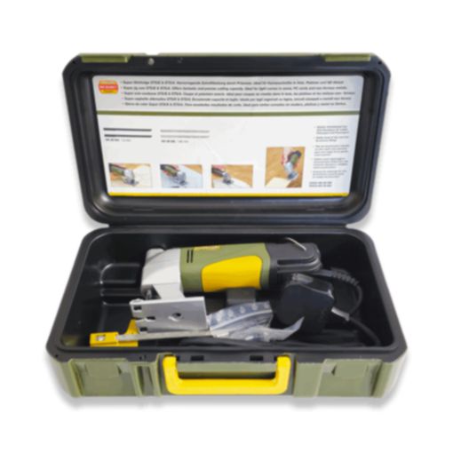 Stable head of die-cast zinc for precise fitting. The housing head is made of glass-fibre reinforced POLYAMIDE. Special balanced, low noise DC motor with high life expectancy. The stroke speed is variable by means of full wave electronic speed control. Footplate adjustable up to 45° for mitre cuts. Ideal for tight curves in wood (up to 12mm), PC cards to 5mm and non-ferrous metals to 3mm. Complete with 4 Super-Cut sawing blades of various pitches for wood, plastic and metal. Safely stored in an attractive and extremely stable case made from high-grade polypropylene.