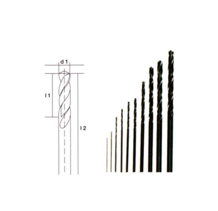 10-piece set. Similar to DIN 338. Ø 0.3 - 0.5 - 0.8 - 1 - 1.2 - 1.5 - 2 - 2.5 - 3 - 3.2mm. For drilling non-ferrous metal, steel and stainless steel. In labelled cassette with fold back and stand function. For clamping we recommend our 3-jaw drill chuck.