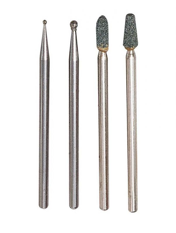 Diamond bit 1: ball Ø 1.0mm, diamond bit 2: ball Ø 1.8mm, silicon carbide bit cone 3/2 x 5mm, and bullet 2/2.5 x 7mm.