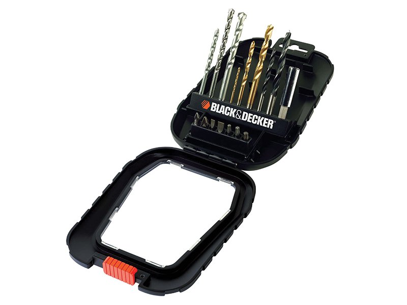The Black & Decker A7186 New Family Accessory 16 piece set contains various drill bits, suitable for drilling wood, masonry and metal.